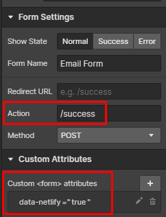 data-netlifytrueIn the form action setting, define the path to a page to redirect the user after form submission
