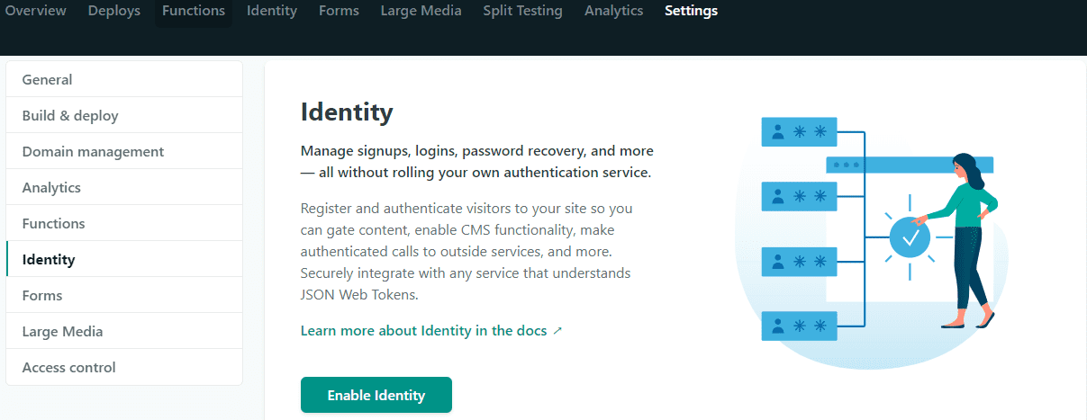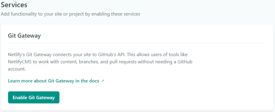 Then, go to the bottom of the same page and click on Enable Git Gateway under Services.