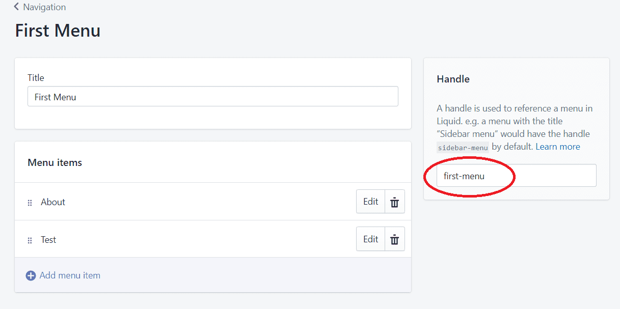 Menus in Shopify can be created by following the path Online Store > Navigation. Don't forget to create the menu in Shopify and take note of the handle of the menu, otherwise your menu will not work at all.