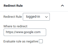- Evaluate as negative is a checkbox that allows you to basically invert the functionality, it will redirect if the rule evaluates as "true";