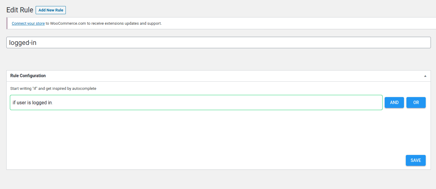 For example if you write: "if user is logged in", this rule will evaluate as true only the user is logged in. You can also chain multiple conditions pressing on AND or on OR.